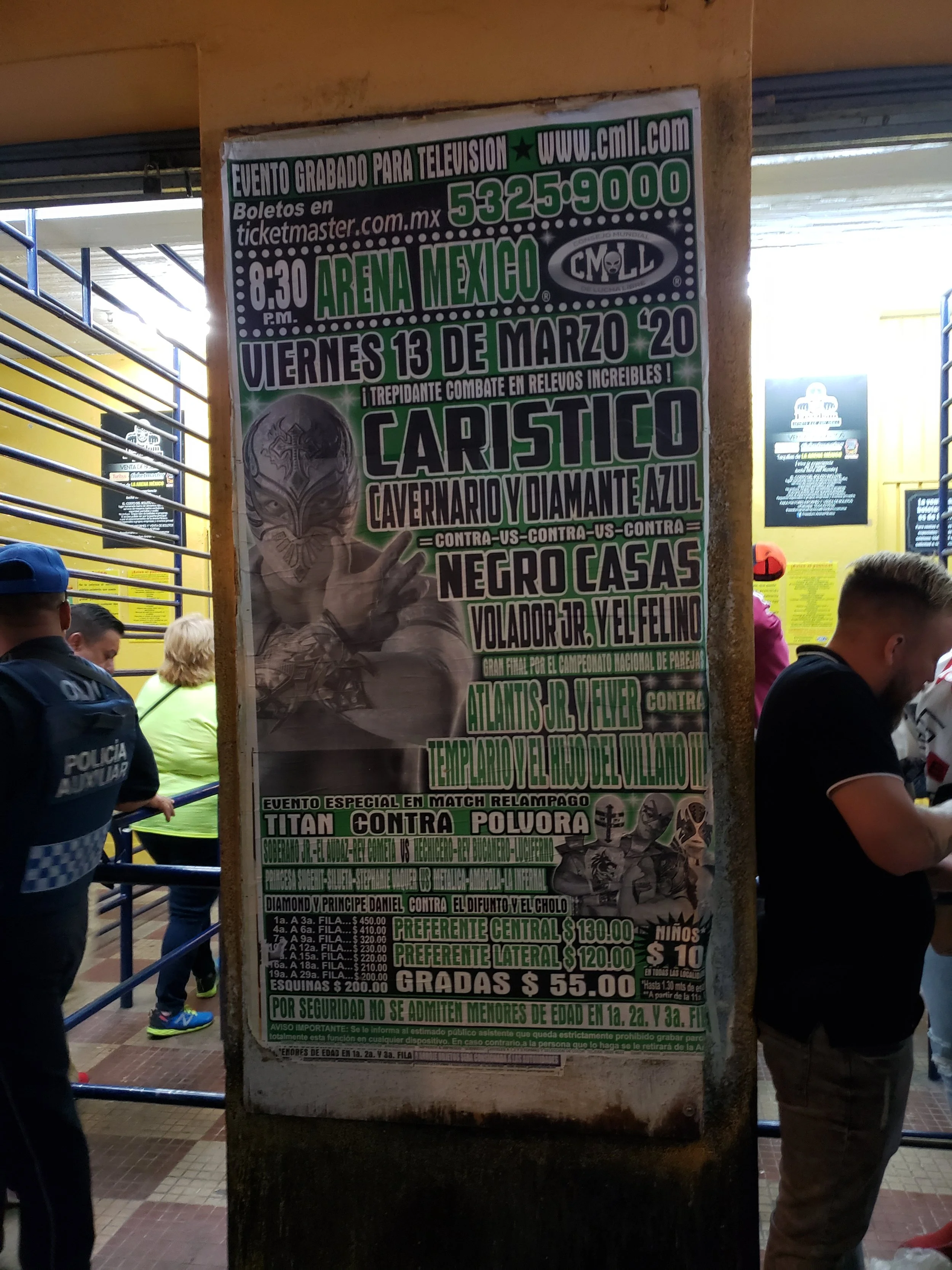 There will be posters outside the event highlighting the bill. Usually flyers are also available at the box office and inside the venue to follow the bouts. There will be street food and various items for sale outside the venue. Luchador masks and toys, mostly, which I found to be less worthwhile than at the Mercado De Artesanias La Ciudadela.